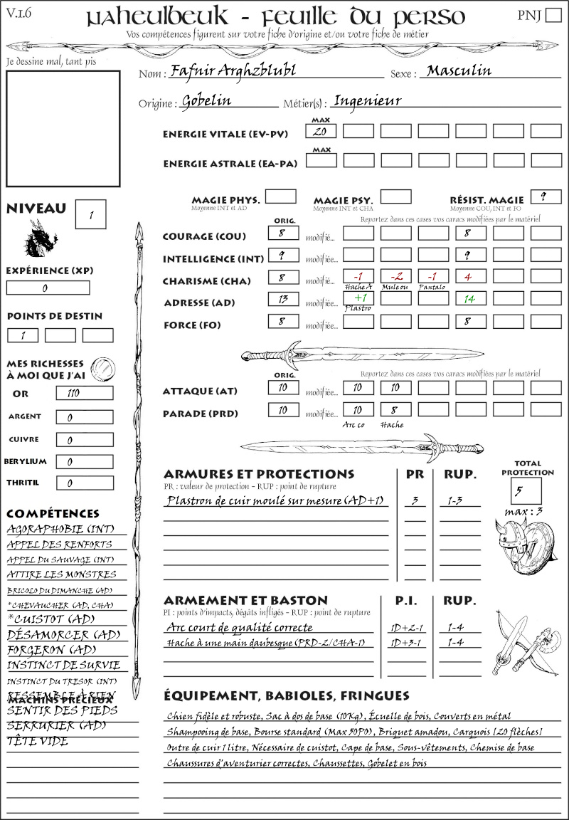 Fafnir est née dans un des rare petit village gobelin en terre de fang ou la paix règne enfin presque car à l’âge de 8 ans des Gobelin d’un autre clan vinrent piller son village le laissant seul blesser mais en vie pour qu’il repende la crainte dans les villages alentour ce que bien évidement il ne fit pas. Non Fafnir pris son chien la mule de son père vielle mais encore robuste quelque affaire et il partit en quête d’un village ou d’une ville accueillantes il n’en trouva un que deux semaines de marche plus tard c’était une grande ville là il y trouva un forgeron gobelin qui voulut bien l’héberger et lui apprendre ses technique il acceptât son offre et deux ans plus tard il avais appris les art de la forge et de la réparation un jour il se rendit dans une auberge en quête d’histoire à écouter et s’est en parlant a l’aubergiste qu’il apprit qu’un groupe d’aventurier cherchait un compagnon supplémentaire il les approcha donc…