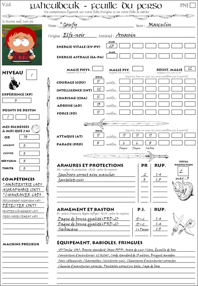 Gouly Pougny, ou Goufy, comme il aime se surnommer, est un elfe noir qui a roulé sa bosse en temps que vendeur d'objets de suicide à Chnafon. Poison, corde, poignard, il aime savoir que quelqu'un meurt. Il se délecte de sous-entendus sur la mort des gens, un sourrir avant le silence, c'est sa devise.
