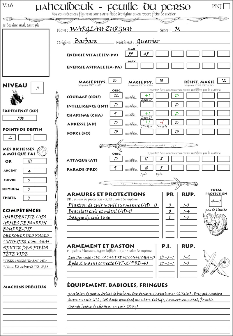 Warglah, contrairement à Conan, est né riche. Ses parents lui ont donné de quoi se payer un solide équipement.