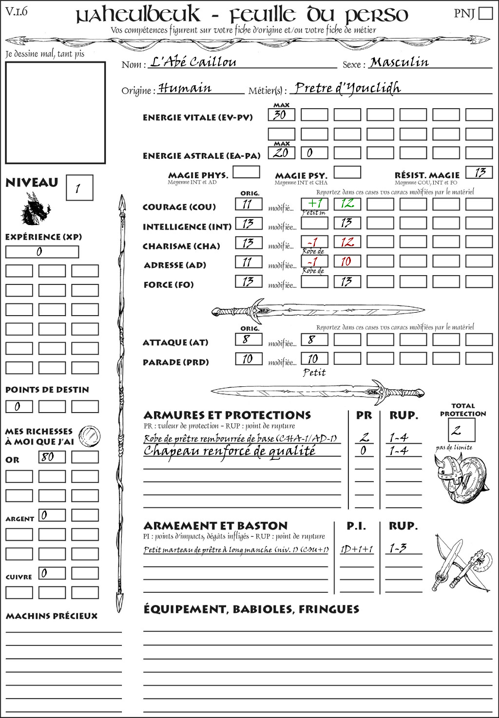 Cadet de sa famille , Guillaume Caillou dut dès son plus jeune âge se convertit au Catholicisme afin d’ éviter à sa noble famille l’ endettement et la perte de leurs terres . Dans ces première années d’éducation, il apprit la théologie , la lecture , l’ écriture, le Latin , le Grec et les mathématiques . Toutes ces connaissances furent approfondies puisqu’ il partit dans la prestigieuse abbaye et université de Toulouse . C’ est ainsi que Guillaume Caillou devint l’ abbé Caillou , un homme connu et respecté de tous pour sa grande sagesse et sa mémoire exceptionnel . On disait même de lui dans les faux-bourg de Toulouse qu’il succéderai un jour à un évêque voir même au pape en personne. Cependant ces heures de gloires furent de courte durée puisqu’il tomba dans le plus grand mal qui existe pour un homme d’ église . L’ alcool . Ce malheur devint si important dans sa vie qu’il finit même par s’ inscrire à des concours de beuveries qu’il gagnât haut-la-main sans problème. Afin d’ éviter tout scandale ces pères prirent la décision de l’ envoyé dans l’ ordre de l’ inquisition nouvellement fondée par le pape. Durant donc plusieurs années Guillaume participât anonymement à plusieurs massacres iconique comme des chasses au sorcières et biens d’ autres atrocités. Puis un jour Guillaume se faisant âgé et fatigué par ses nombreux voyages, l’ évêque du cher lui pardonna ses fautes et il put enfin accomplir un veut qui lui était cher , celui d’ avoir sa propre paroisse. Il fut donc nommé responsable de la petite église du muton noir où manifestement il se passe des choses bien au delà du commun des mortels.